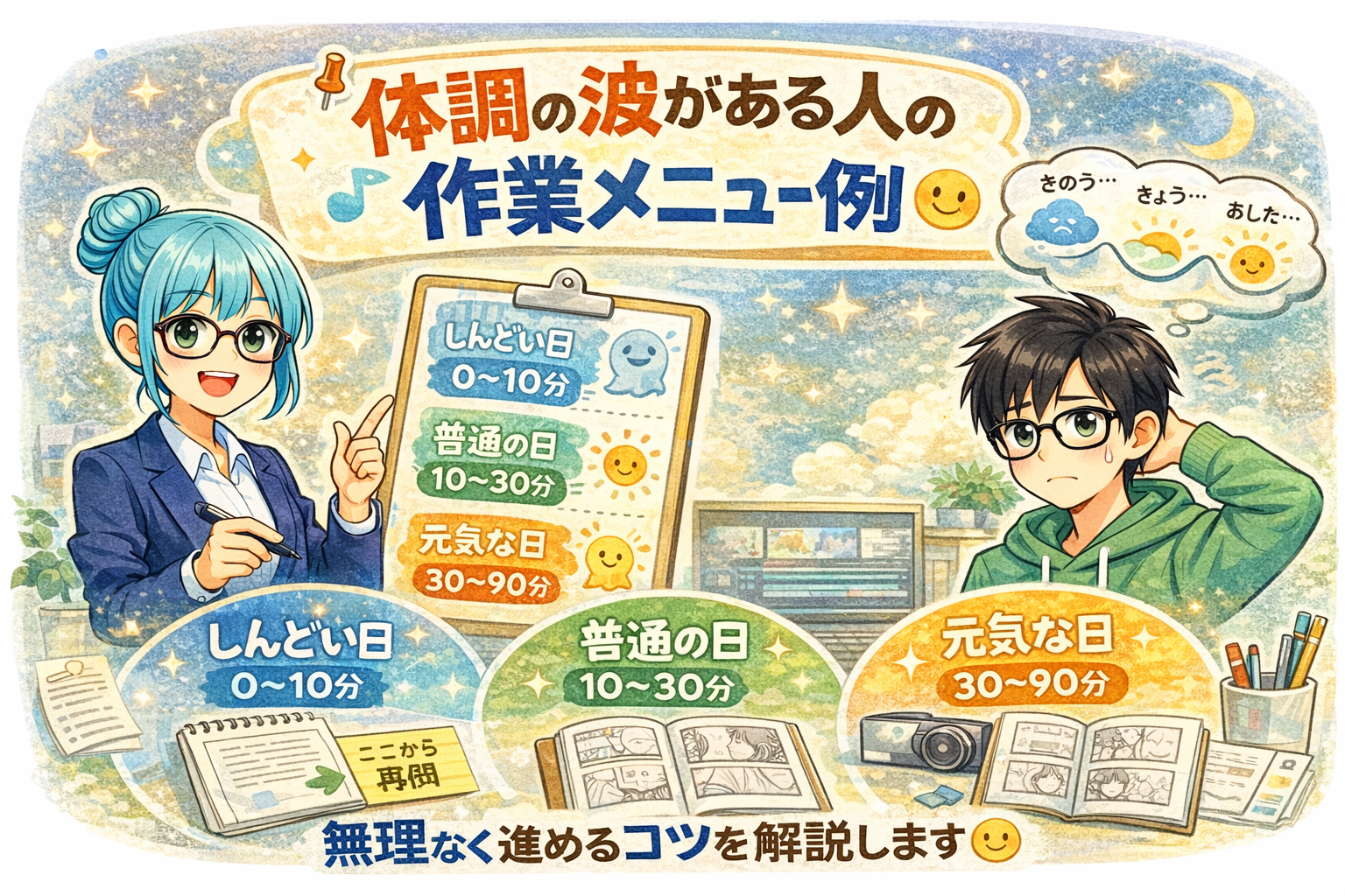 「昨日はできたのに、今日は無理…」「頑張りたい気持ちはあるけど、体調が安定しない」「在宅で作業できるとしても、続けられるか不安…」 こういう悩み、すごく多いんだよね。体調の波があるのは“甘え”じゃなくて、コンディションの […]