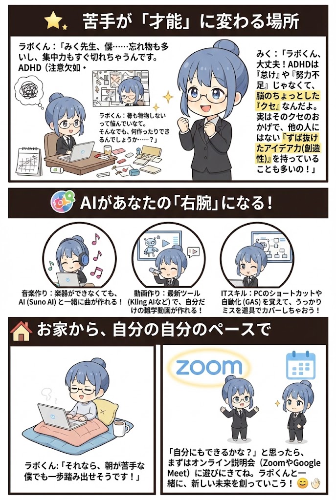 みらいLABOでは、在宅利用が可能な就労継続支援B型事業所として、 といった「デジタル×クリエイティブ」な作業を発信しています。 今回はその中でも人気が高まっているSuno AIを使った音楽制作を、初心者向けの攻略ガイド […]