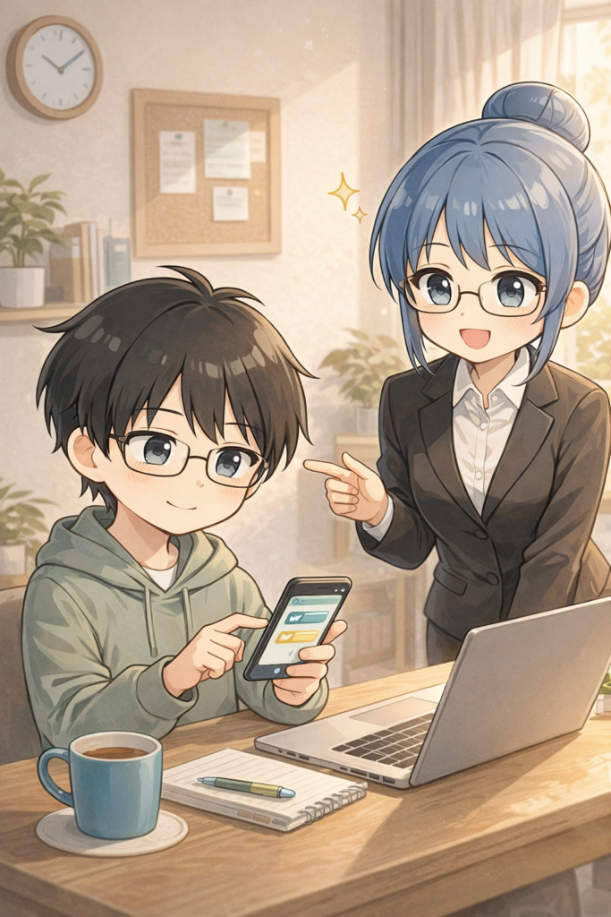 今回は、みらいLABOの在宅メインの利用を例に、スマホでのタイムカード打刻・出勤連絡(在宅開始)を、営業時間内で調整しやすいスタイルについて、対話形式で紹介します。