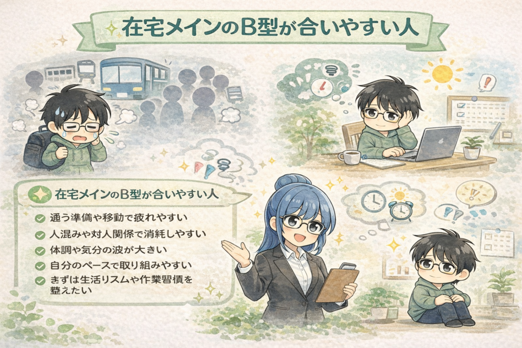 通勤や人混みの負担、体調の波などがある方は、在宅メインのB型が合いやすいことがあります。