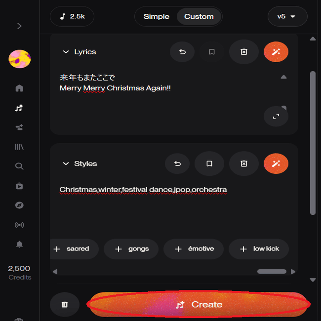 3.“Styles” に、曲のイメージやジャンル、ボーカルスタイルなどを入力。例ではクリスマスを題材にした歌詞にしたので、クリスマスにちなんだスタイルを入力。
